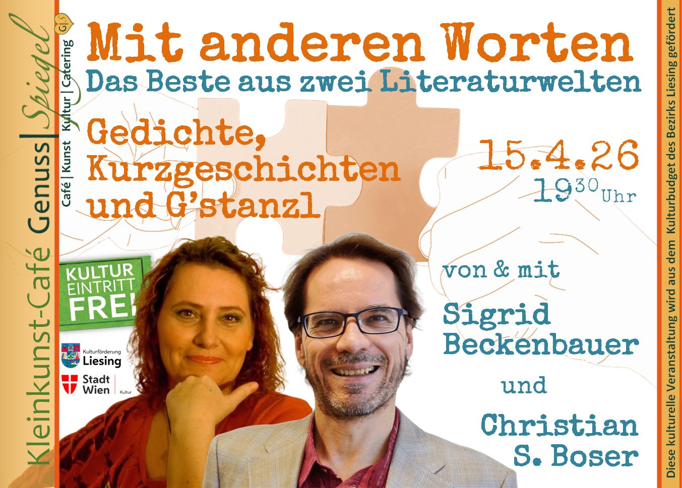 GenussSpiegel präsentiert: „Mit anderen Worten“ – Gedichte, Kurzgeschichten und G’stanzl – von und mit Sigrid BECKENBAUER und Christian S. BOSER – EINTRITT FREI (Hutspende)